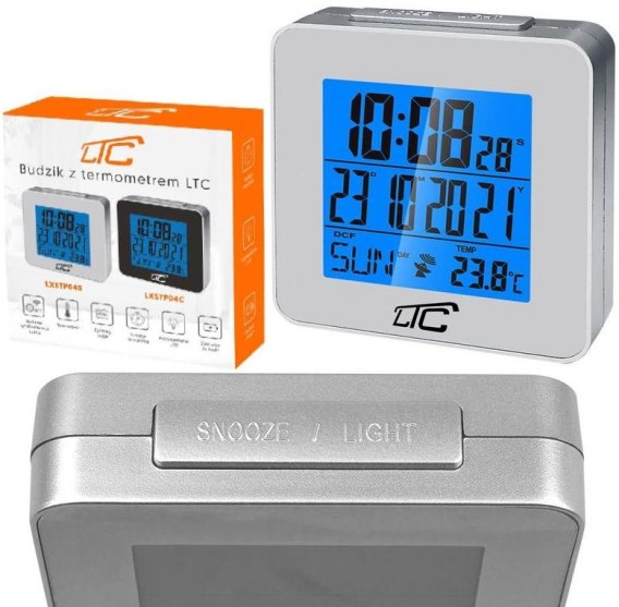 Budzik z termometrem LTC, sterowany radiowo, srebrny LXSTP04S