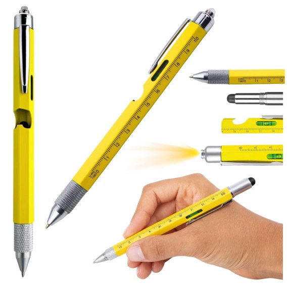 Długopis Wielofunkcyjny 8w1 Poziomica Latarka LED Śrubokręt Żółty
