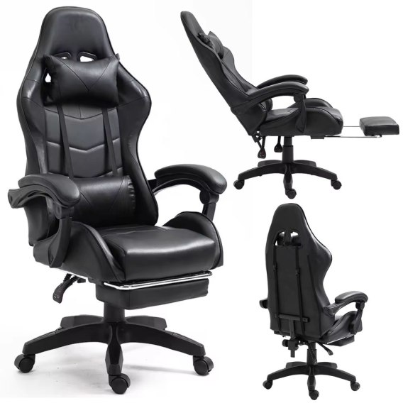Fotel Gamingowy LEAN Obrotowy Biurowy Z Podnóżkiem Poduszki Czarny