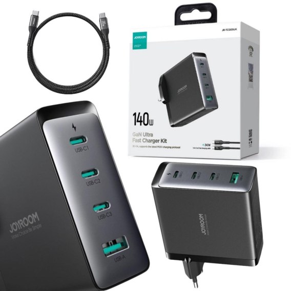 Ładowarka sieciowa Joyroom GaN Ultra JR-TCG05EU 140W PD 3.0 QC 3.0 3x USB-C 1x USB-A czarna + kabel