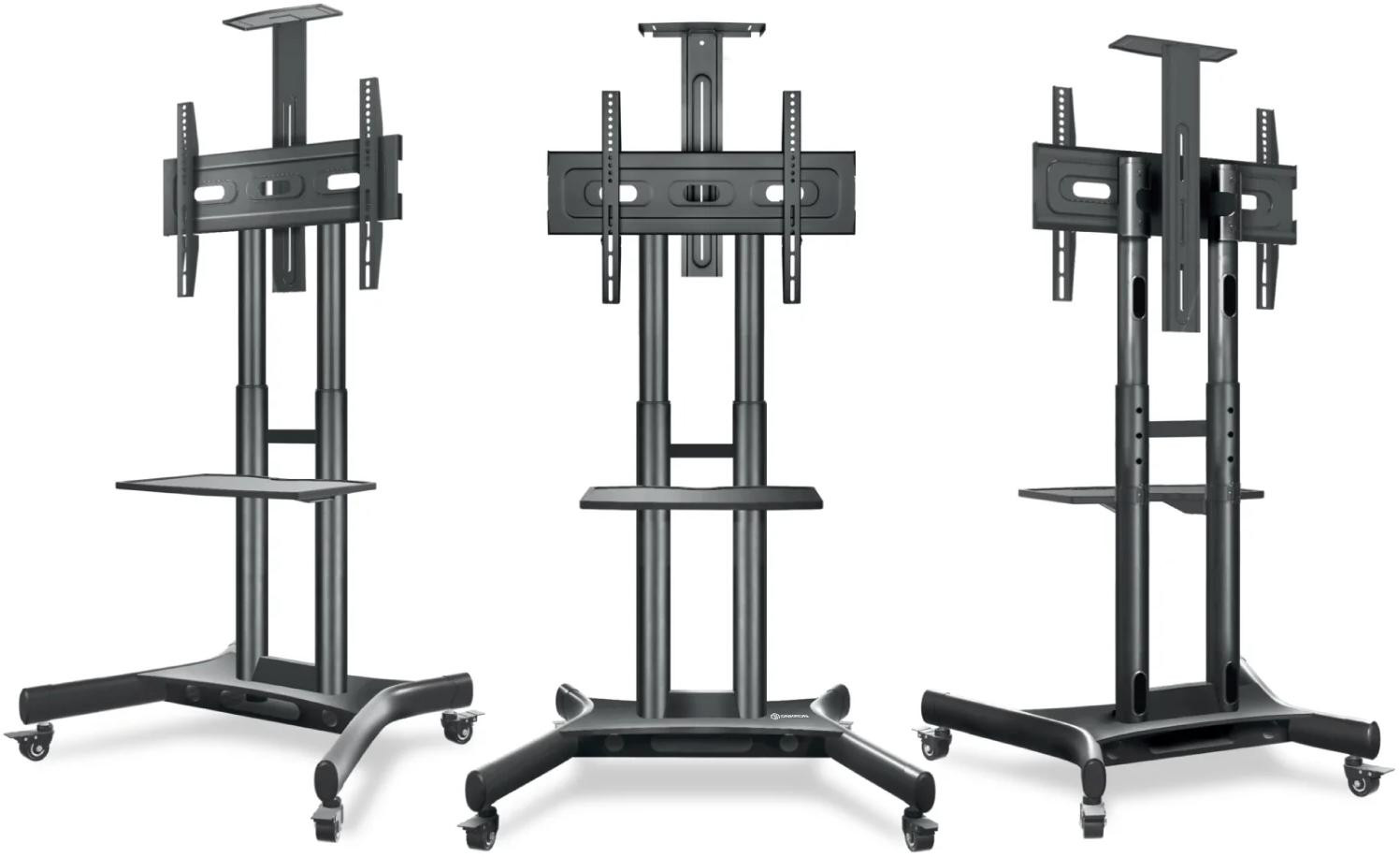- Mobilność: Stojak posiada cztery kółka, z których dwa są blokowane, co zapewnia łatwe przemieszczanie i stabilne ustawienie telewizora.