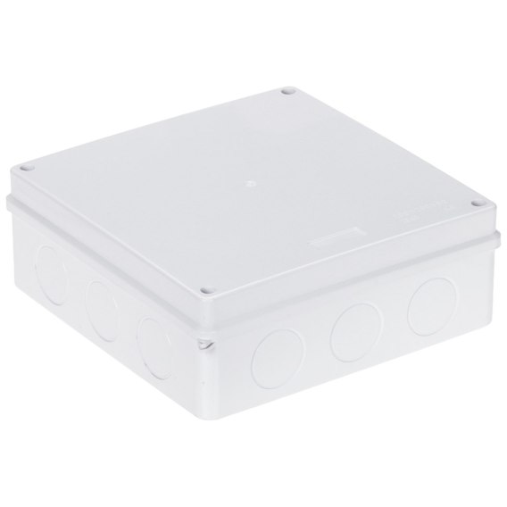 Natynkowa puszka odgałęźna PKRT-200X200 spełnia wymogi klasy szczelności IP65. Po bokach puszki zaznaczone zostały miejsca do samodzielnego wycięcia przepustów kablowych.