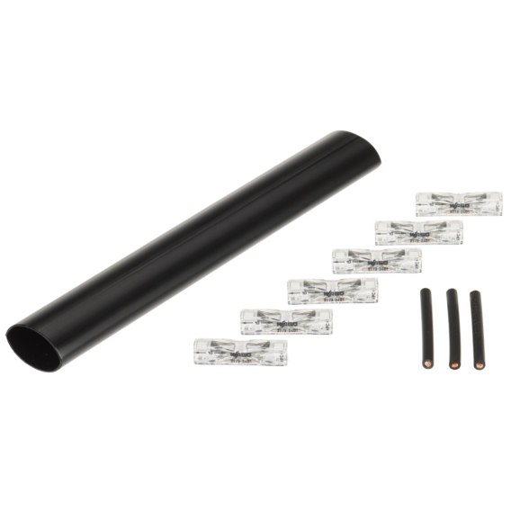 Zestaw zawiera sześć sztuk szybkozłączek przelotowych WAGO-2773-2401, trzy przewody jednodrutowe 4 mm² o długości 4 cm oraz termokurczliwą rurę z klejem o średnicy 17 mm i długości 16 cm