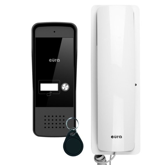 Jednorodzinny domofon "Eura" ADP-25A3 składa się z unifonu, kasety zewnętrznej i zasilacza sieciowego DC 12V.