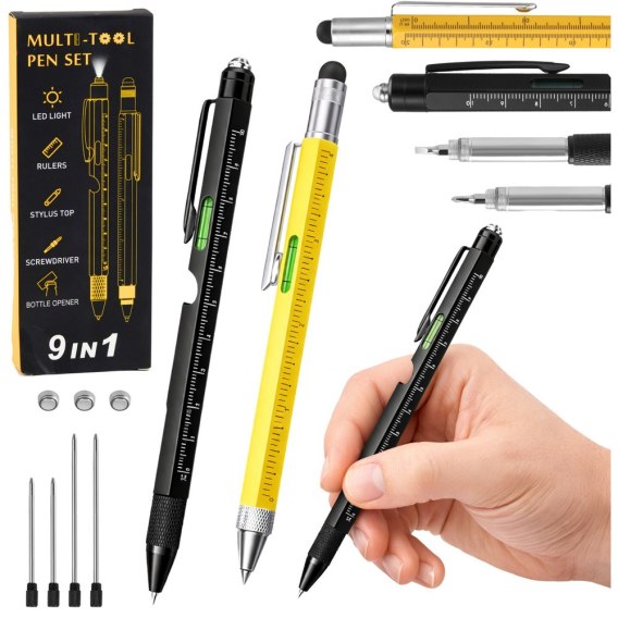 Długopisy Wielofunkcyjne 9w1 Poziomica Latarka Śrubokręt Żółty Czarny 2szt