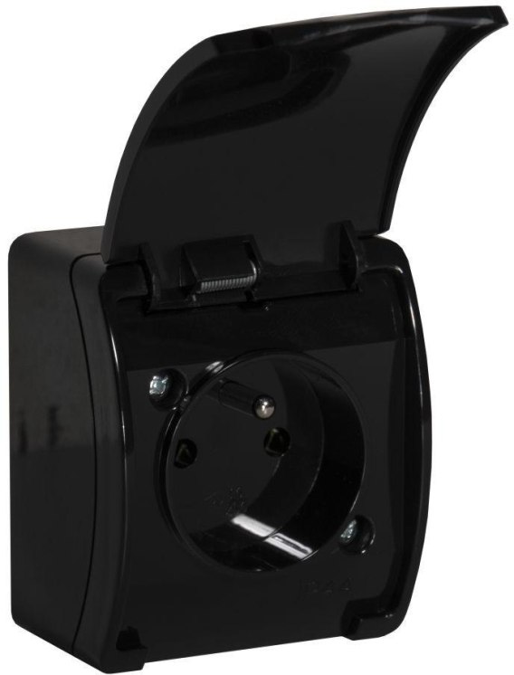Gniazdo natynkowe pojedyncze z uziemieniem, z klapką VIPLAST KOALA CZARNE IP44 161-05
