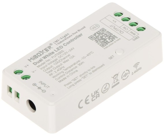 Sterownik oświetlenia FUT035S przeznaczony jest do kontrolowania załączenia, jasności świecenia oraz temperatury barwowej dwukanałowych białych taśm LED CCT (Corelated Color Temperature)