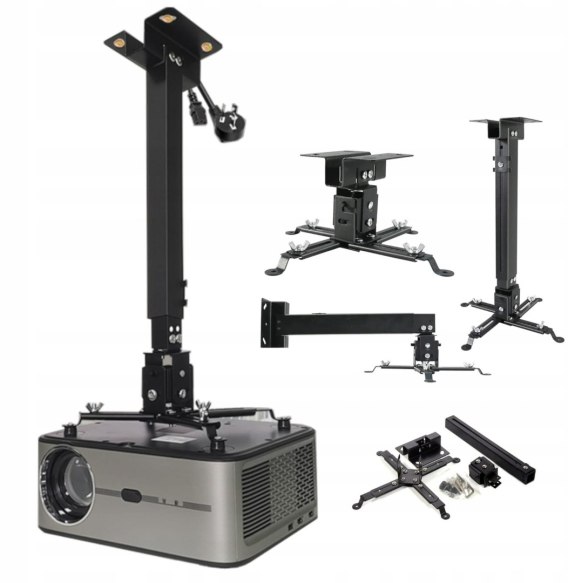 - W komplecie akcesoria montażowe: wszystkie narzędzia do montażu, wiele rodzajów śrub pasujących do wszystkich projektorów, kołki rozporowe. Jedyne co musisz zrobić we własnym zakresie to wywiercić otwory w ścianie lub suficie pod uchwyt.