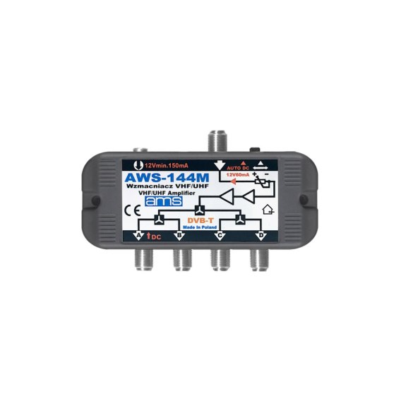 Wejścia/wyjścia: 1/4 Szumy własne: =< 4 dB Złącza typu F: 75 Ohm Zakres częstotliwości: 87 - 790 MHz Wzmocnienie narastające: 14/17 dB Maksymalny poziom wyjściowy: 2 kTV - 100 dBuV Tłumienie niedopasowania: >= 10 dB Zakres regulacji wzmocnienia (środek pasma): 0 - 14 dB Pobór prądu: 65 mA Temperatura pracy: -25°C - 55°C Zasilanie: DC 12 V Zasilanie przez zasilacz stabilizowany 12 V, 100 mA z wtykiem jack 3,5 mm (dołączony do zestawu) lub odpowiednie wejście antenowe (oznaczone DC). ---------- Zastosowanie: wewnątrz pomieszczeń.