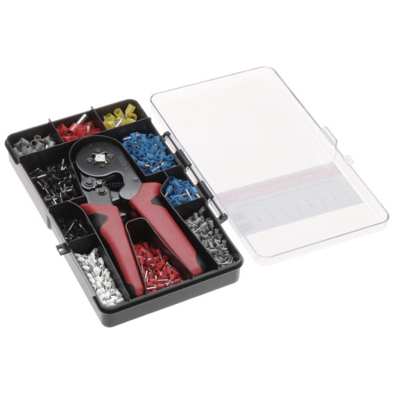 Zestaw zawiera zaciskacz do tulejek kablowych oraz organizer mieszczący w sobie 8 różnych rozmiarów końcówek do zaciskania
