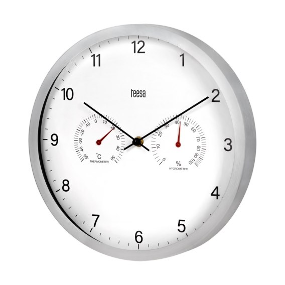 Oprócz precyzyjnego wskazywania czasu, zegar Teesa został wyposażony w praktyczny termometr oraz hydrometr. Dzięki nim w każdej chwili można sprawdzić temperaturę oraz poziom wilgotności powietrza, co jest szczególnie przydatne w domach, biurach czy warsztatach. To doskonałe narzędzie do dbania o optymalne warunki otoczenia, sprzyjające zdrowiu i komfortowi użytkowników.